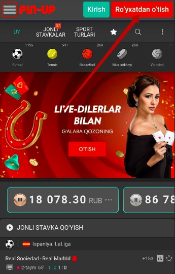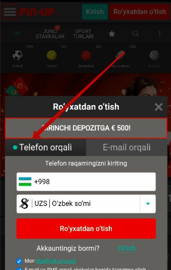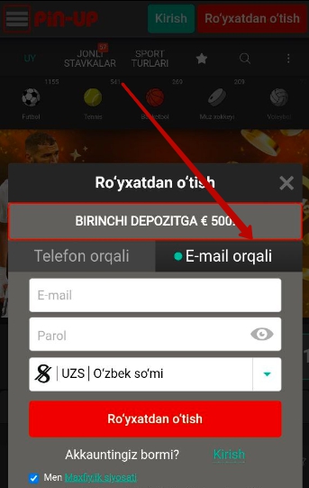 Pin-Up mobil ilovasi yordamida ro‘yxatdan o‘tish uchun quyidagi ko‘rsatmalarga amal qiling: